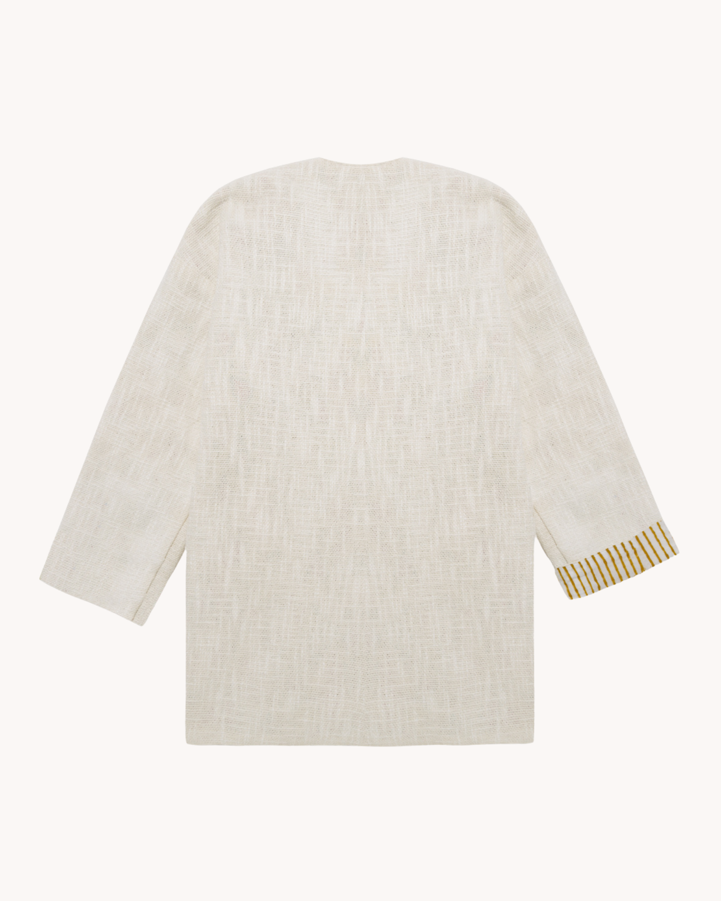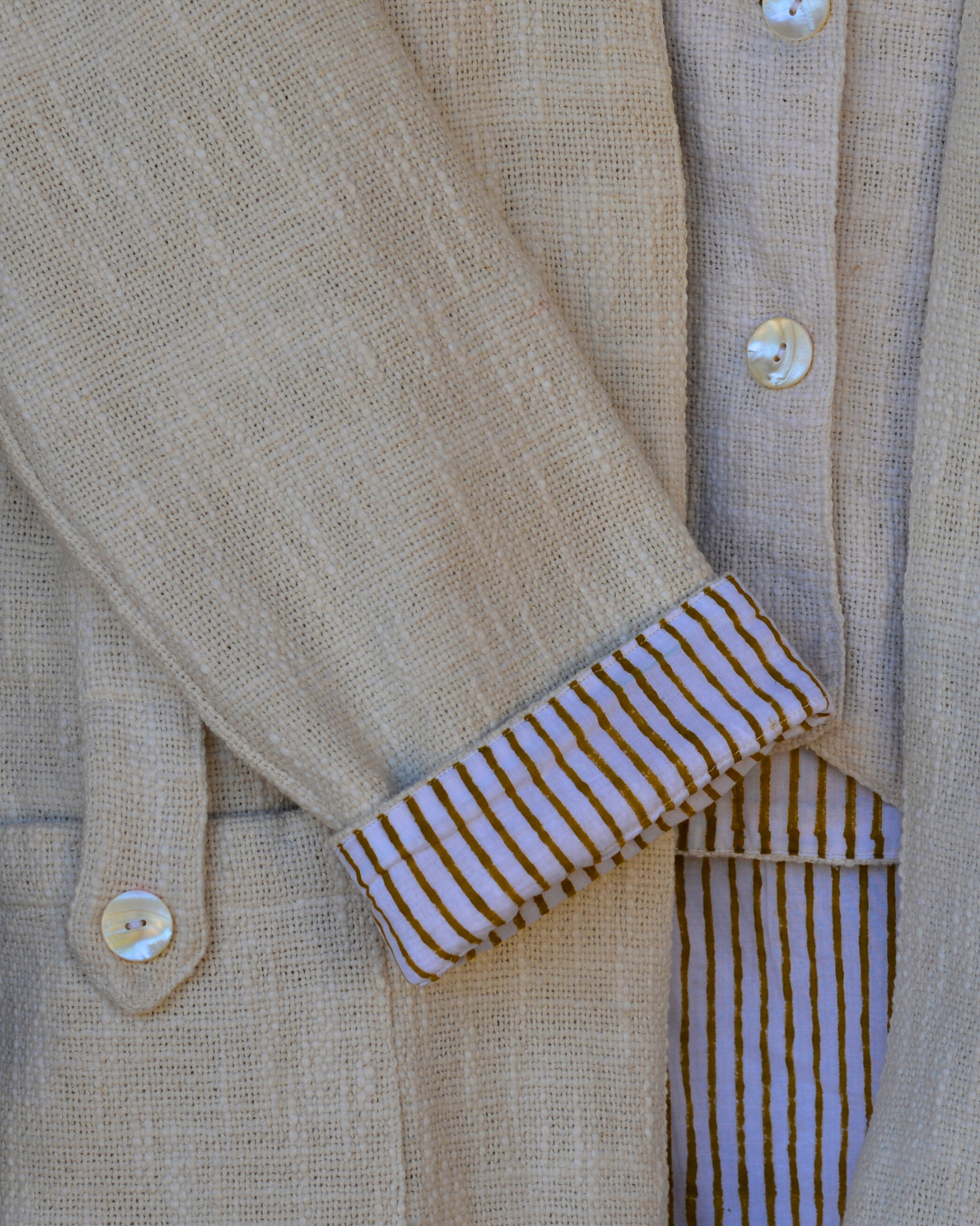 Chaqueta midi confeccionada al 100% en algodón orgánico, con manga 3/4 y con forro interior estampado artesanalmente mediante la técnica de Block Print, combina un estilo clásico con un toque moderno, perfecta para cualquier ocasión.