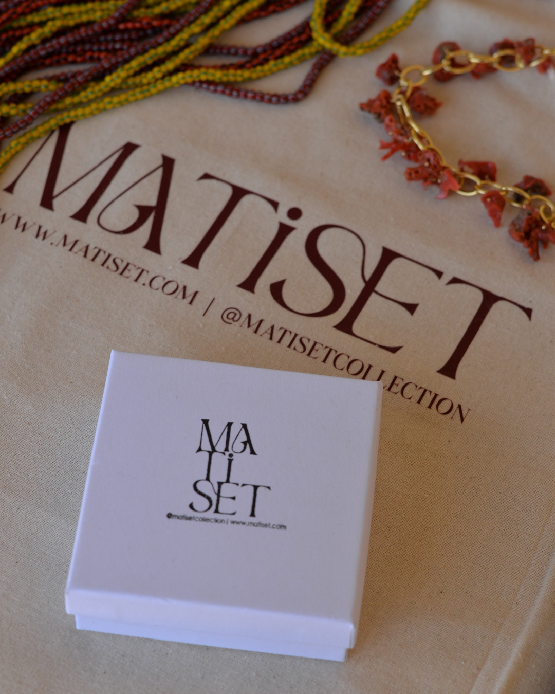Cada joya viaja protegida en un packaging cuidadosamente diseñado, ya sea en nuestra caja Matiset, o pequeña bolsa de lino Matiset y nuestras prendas en una bolsa Tote de algodón orgánico, todos con nuestro logotipo grabado.